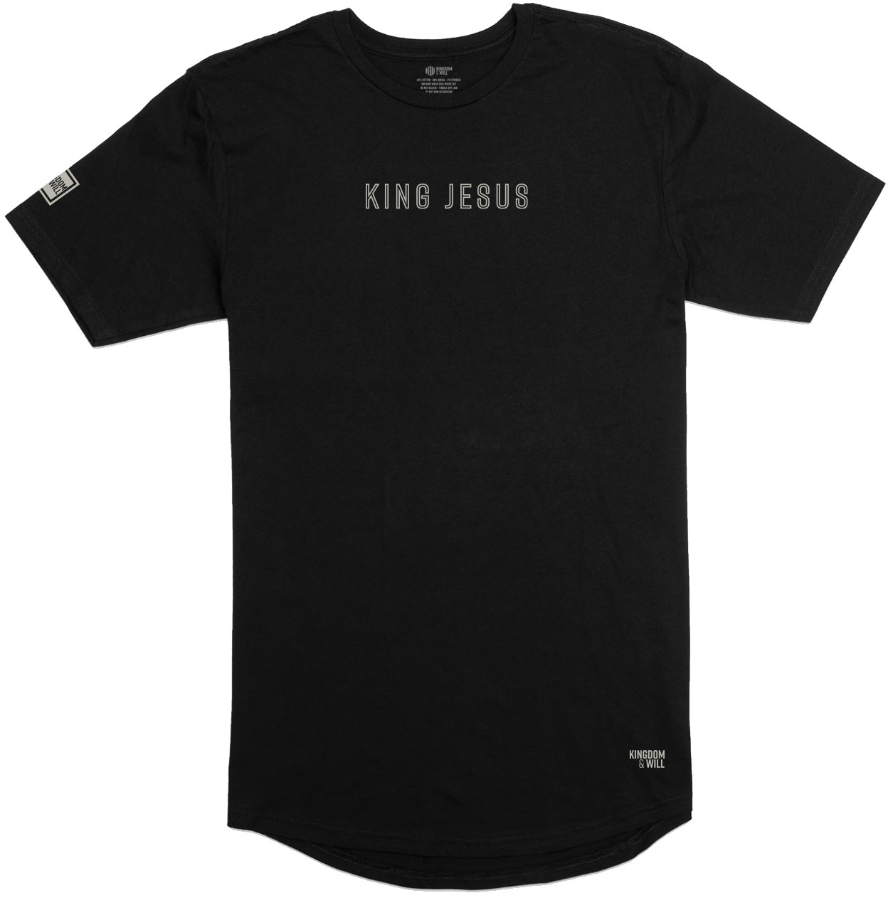 "King Jesus" is printed front and center in red, white, and gray. Our Classic Kingdom & Will logo is on the right sleeve. Our wordmark is just above the left hemline.