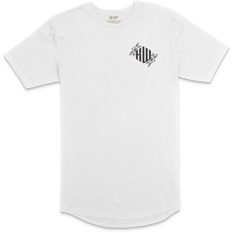 - Hangs about 2.75" lower than a standard tee with a curved hem.