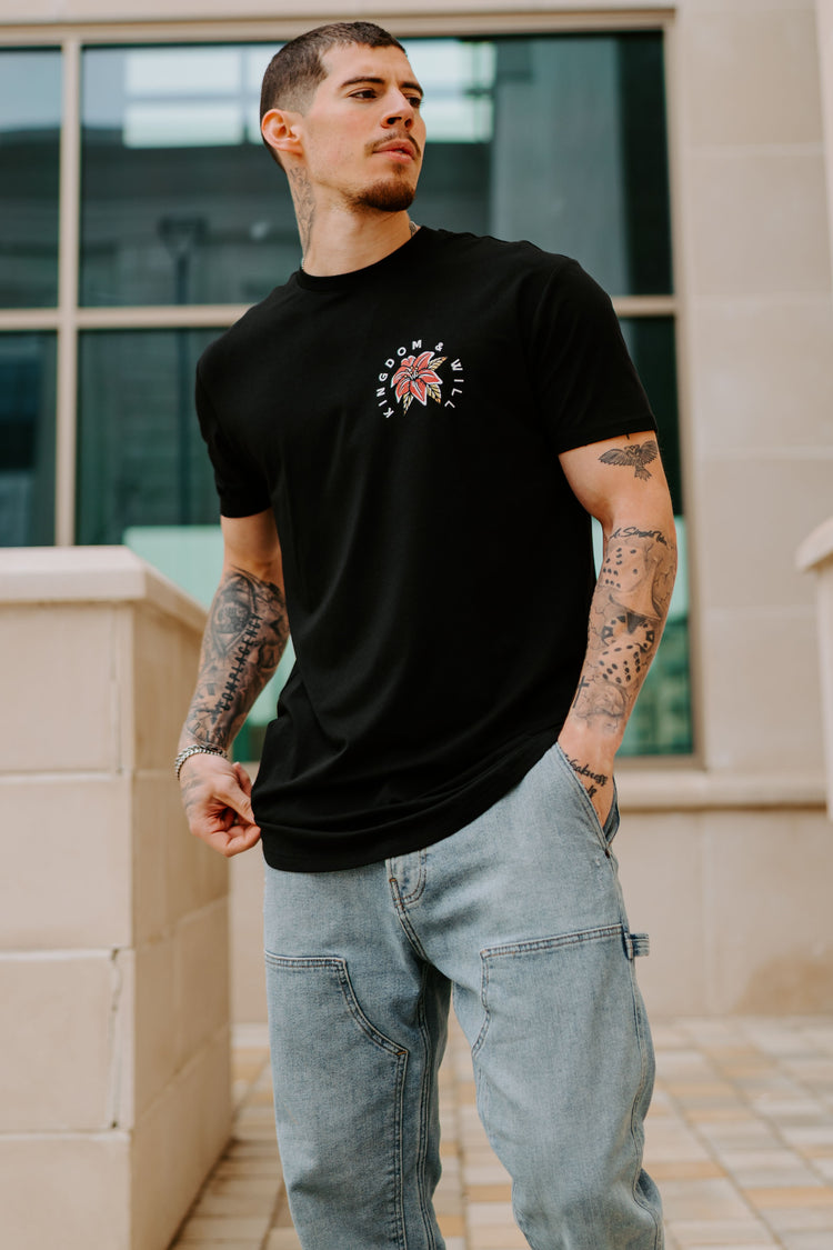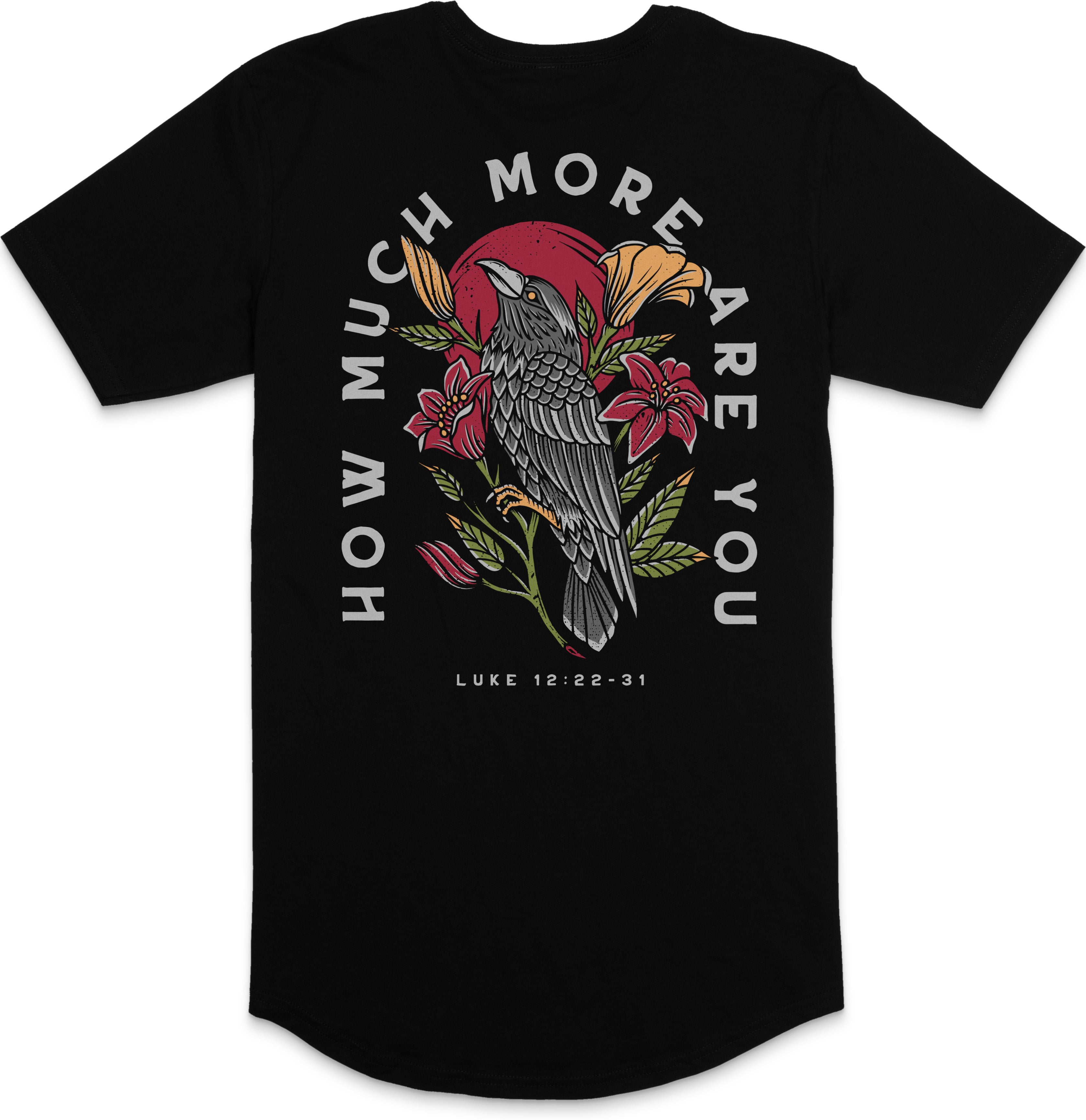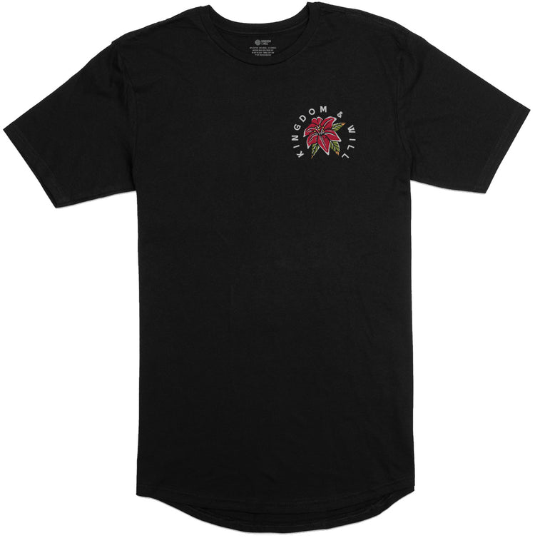 - Hangs about 2.75" lower than a standard tee with a curved hem.
