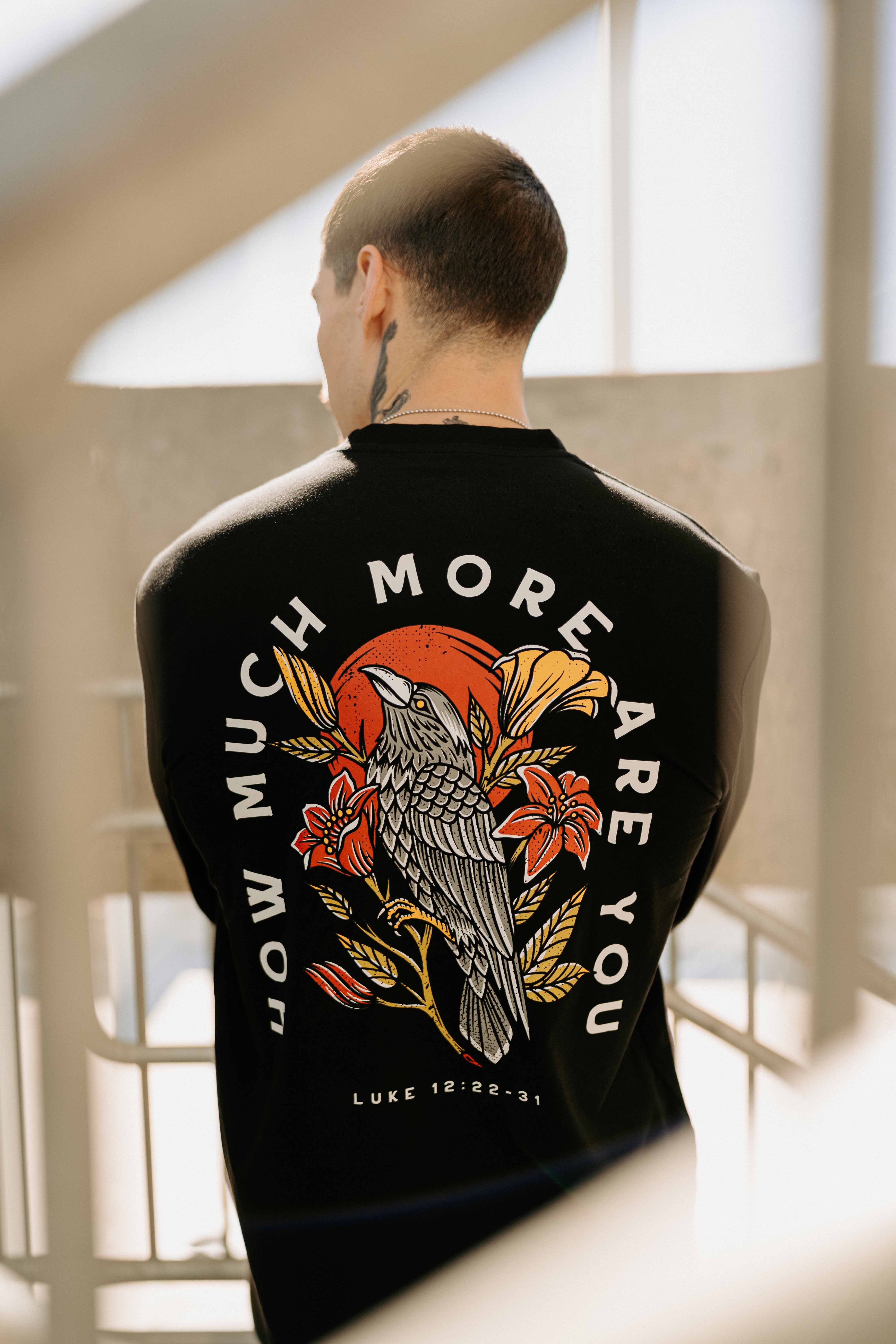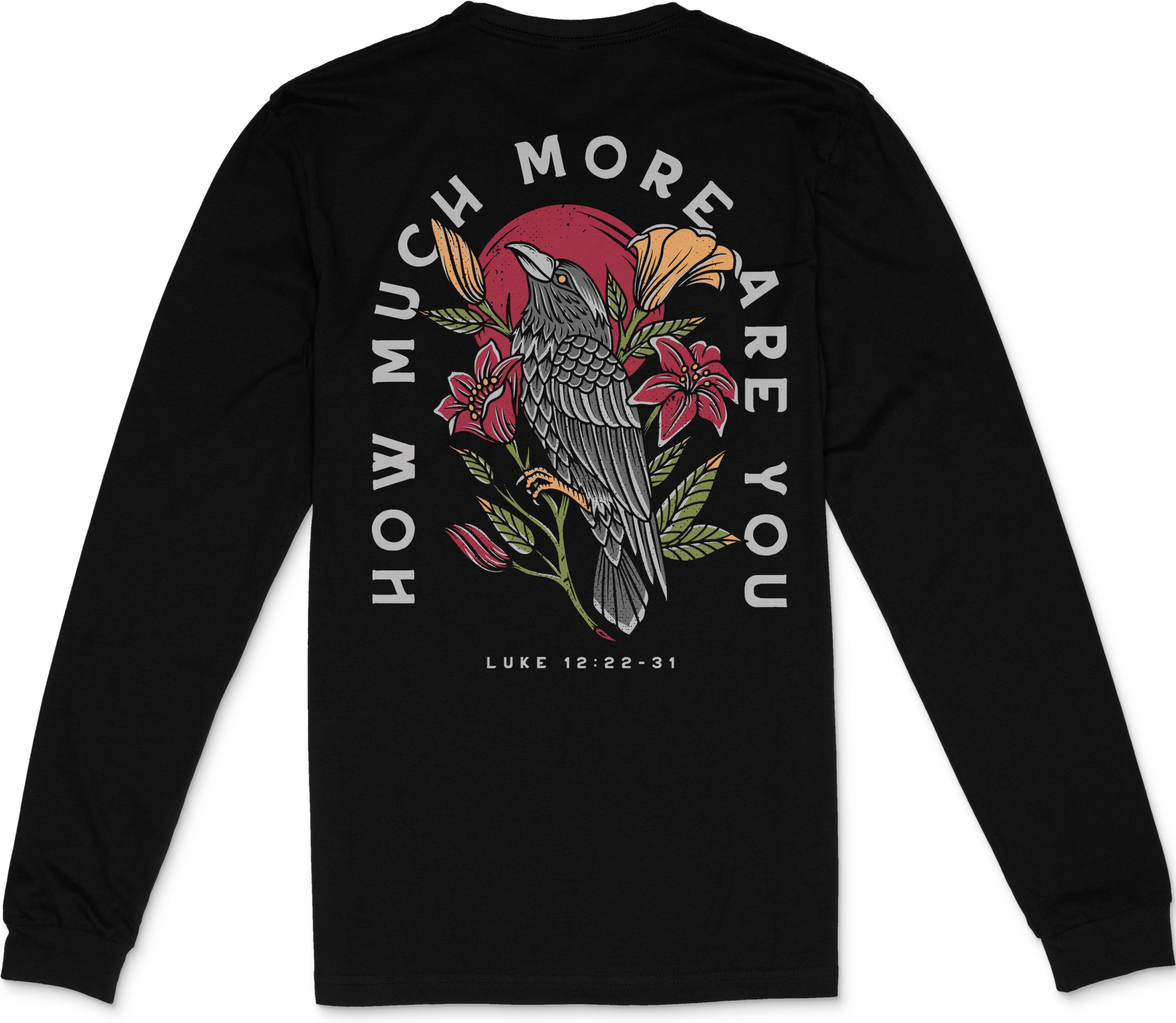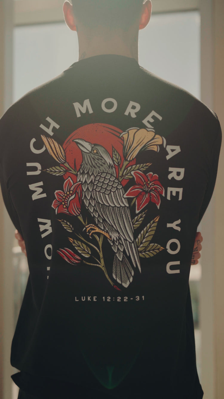 "And he said unto his disciples, Therefore I say unto you, take no thought for your life, what ye shall eat; neither for the body, what ye shall put on. The life is more than meat, and the body is more than raiment. Consider the ravens: for they neither sow nor reap; which neither have storehouse nor barn; and God feedeth them: how much more are ye better than the fowls?
