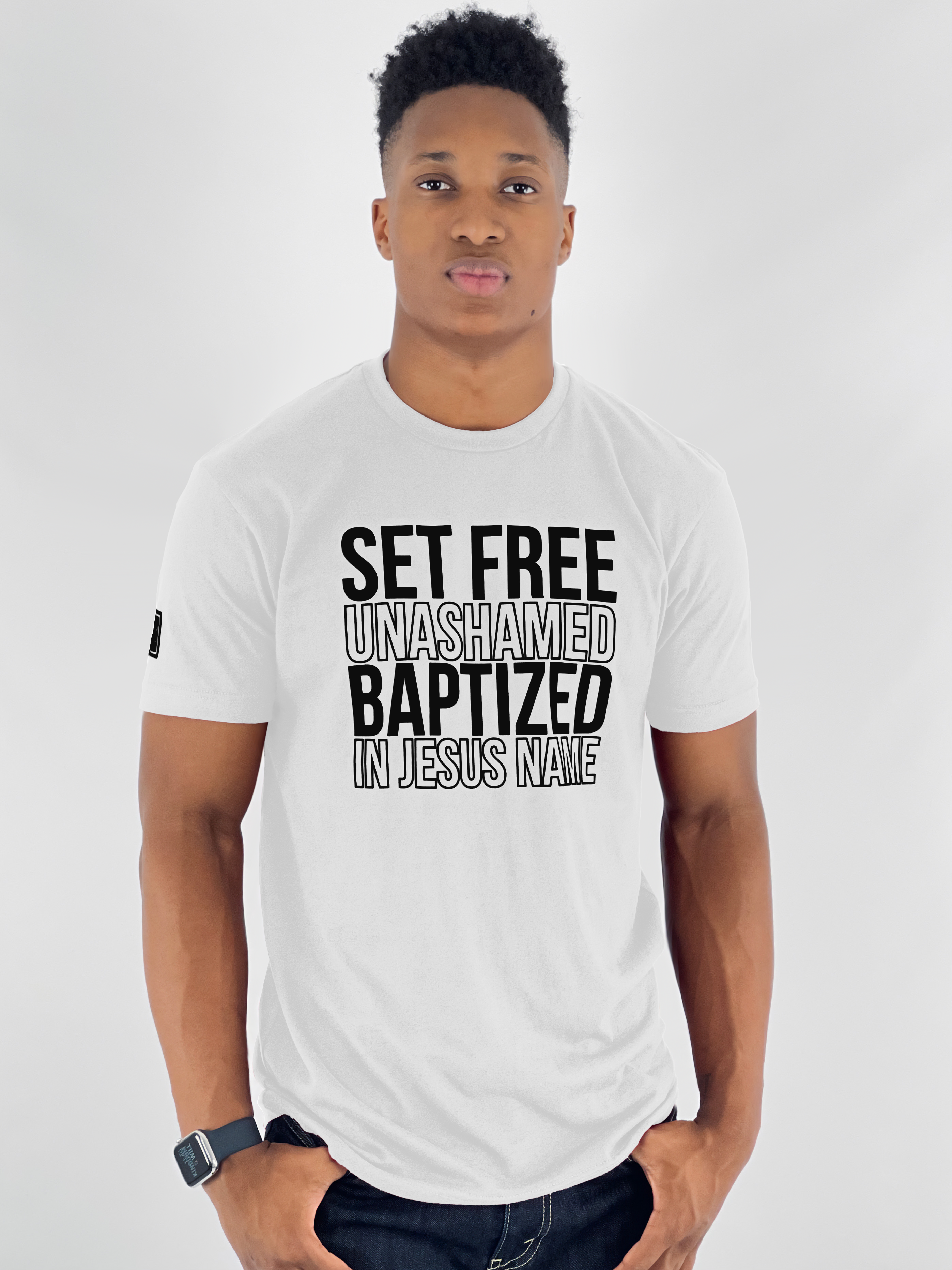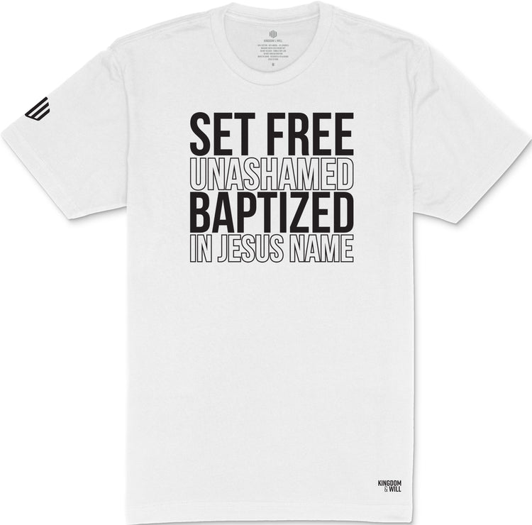"Set Free, Unashamed, Baptized in Jesus Name" is printed front and center in black. Our KW lettermark logo is on the right sleeve. Our wordmark is just above the left hemline.
