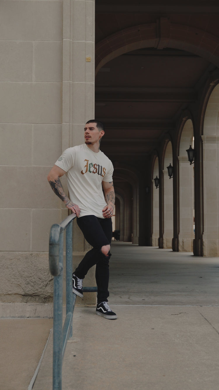 "Jesus" is printed front and center in our beautiful Earth colorway. Our modern KW lettermark logo is on the right sleeve. Our wordmark is just above the left hemline.