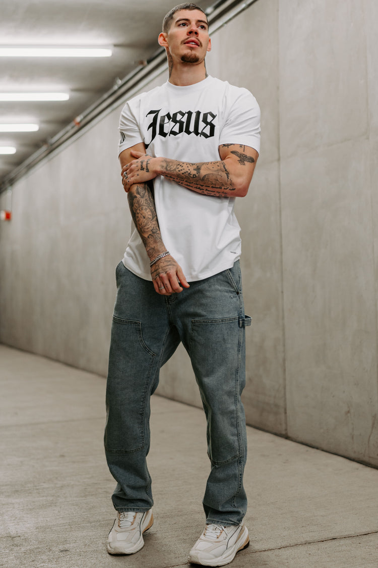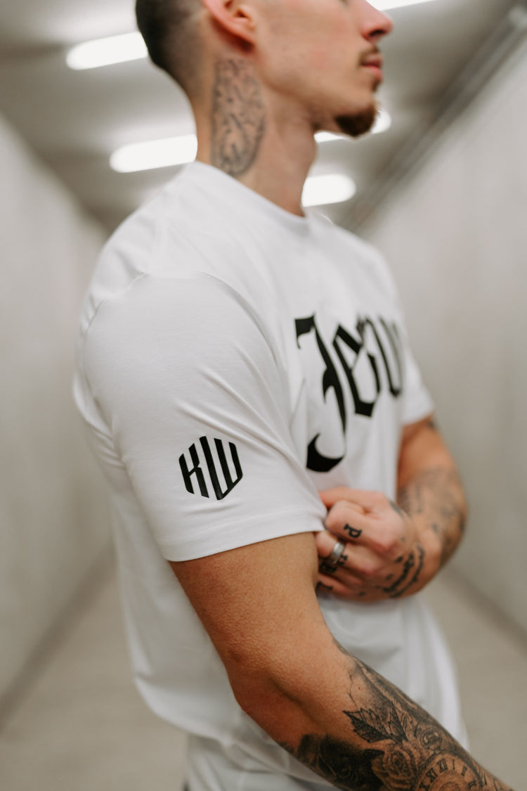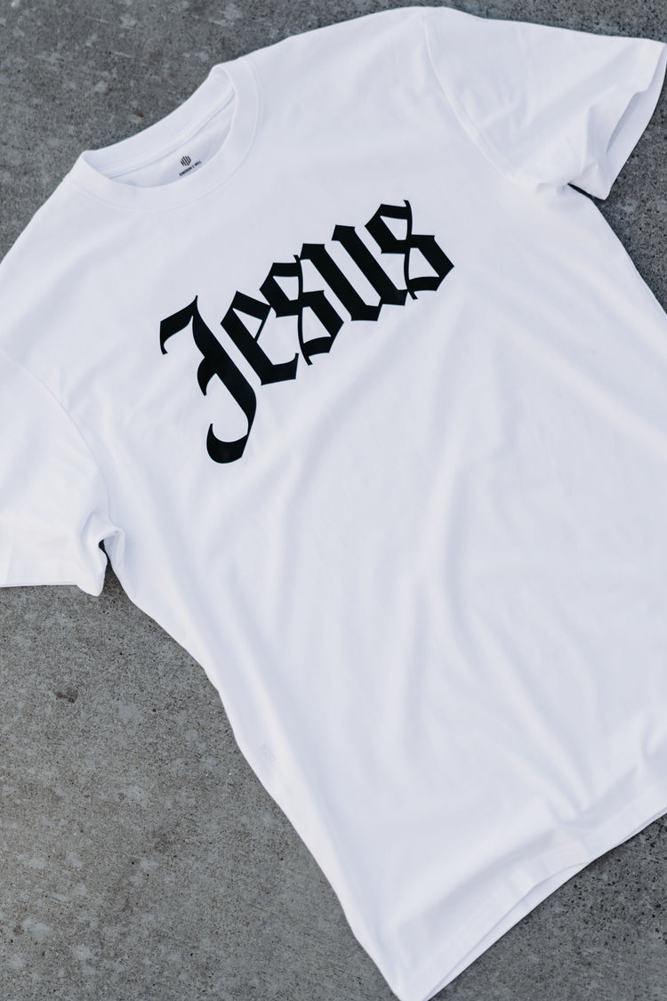 "Jesus" is printed front and center. Our modern KW lettermark logo is on the right sleeve. Our wordmark is just above the left hemline.