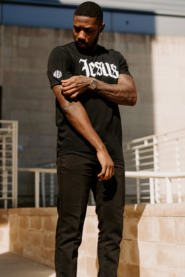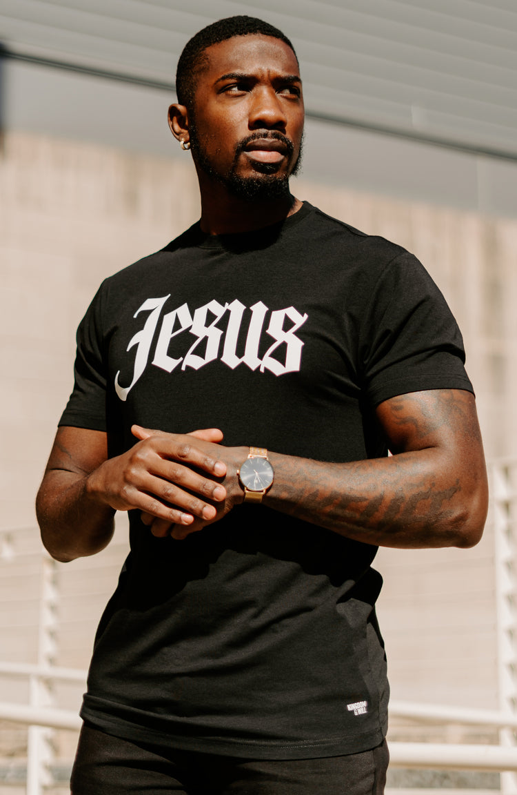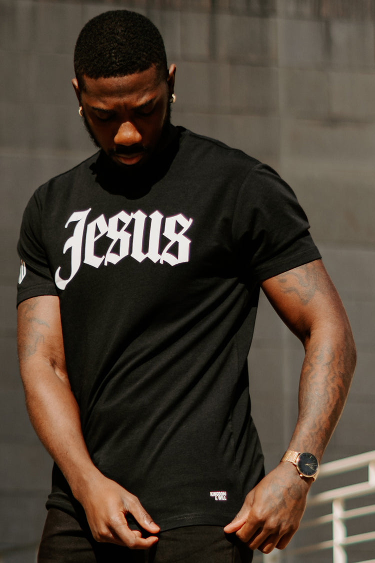 "Jesus" is printed front and center. Our modern KW lettermark logo is on the right sleeve. Our wordmark is just above the left hemline.